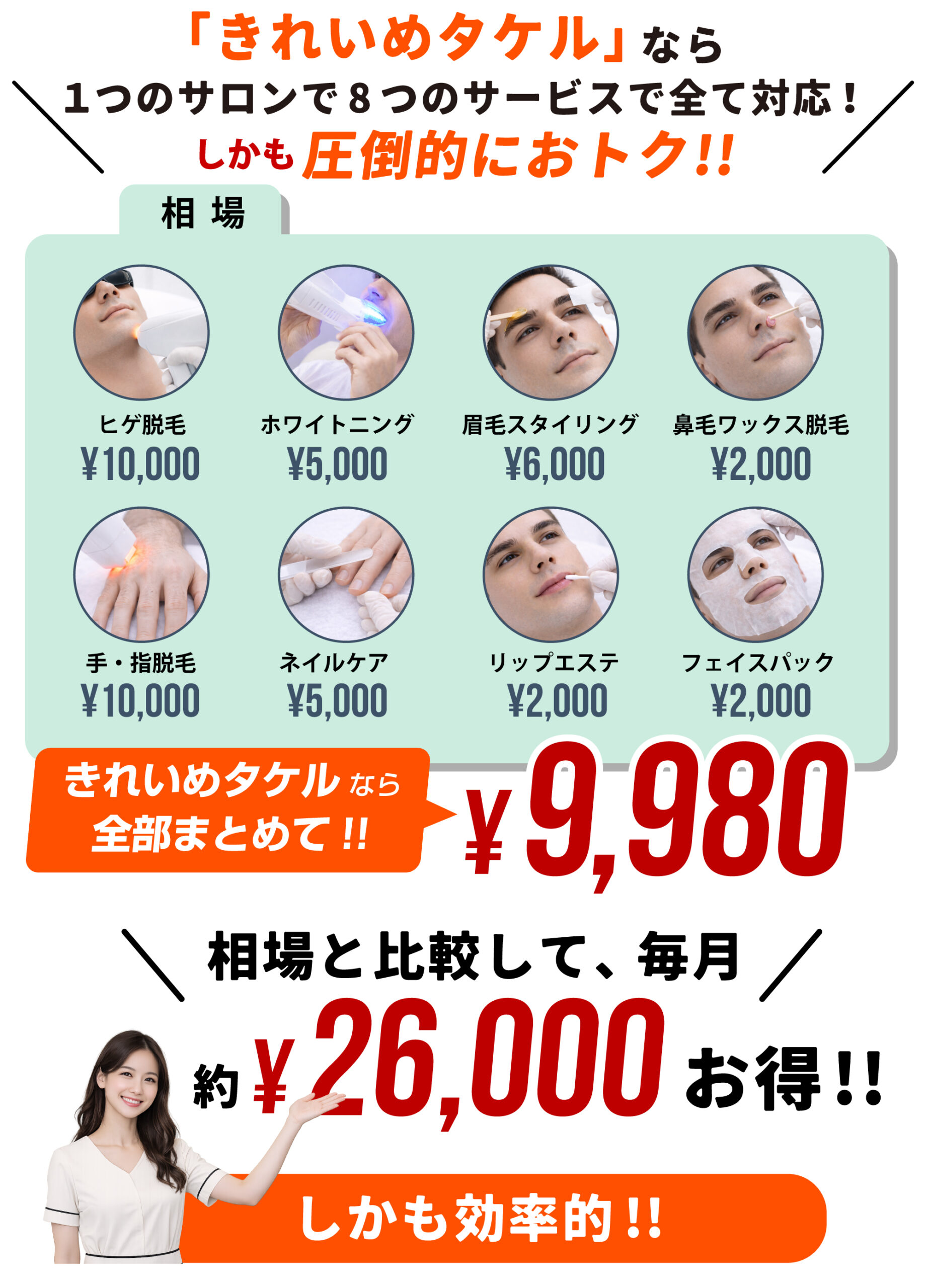 ヒゲ脱毛(8箇所)/ 眉スタイリング / 鼻毛ワックス / ホワイトニング / フェイスケア・リップケア